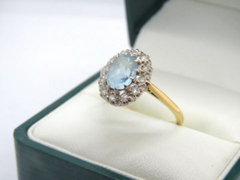 A fine 18ct gold aquamarine and diamond cocktail ring, the central oval cut aquamarine measuring approx 8.4 x 6 x 4.6mm approx 1.3ct, surrounded by a halo of diamonds all set in white metal, on yellow hallmarked gold band, size O-P, 3.7g. In presentation box.