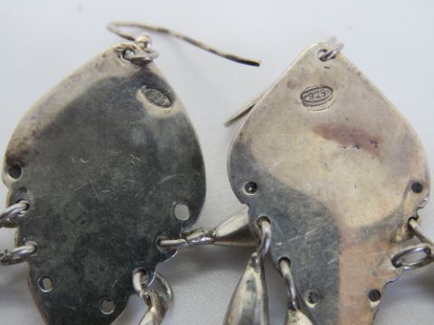 A pair of silver and green stone large drop earrings, stamped 925.