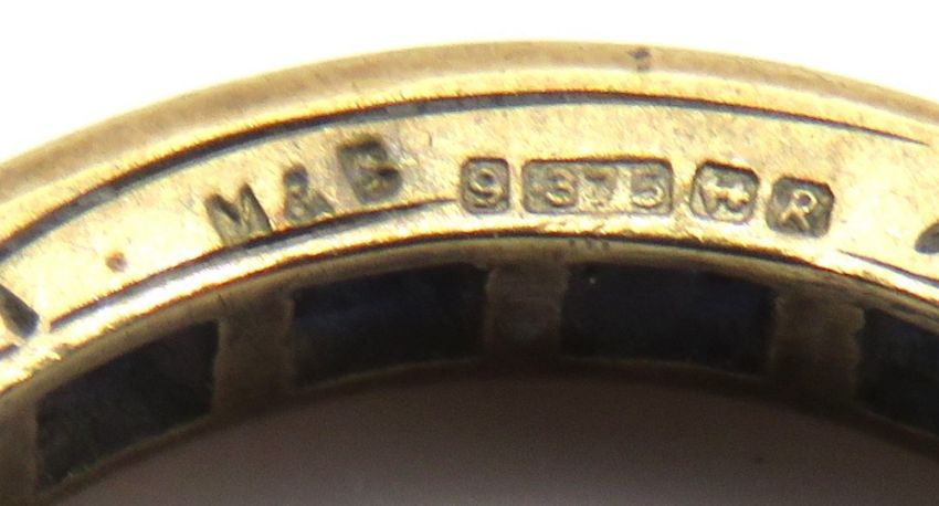 A 9ct gold full eternity ring set with square cut sapphires, hallmarked 375, size M, 2.4g.
