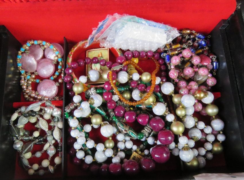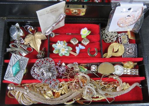 A quantity of costume jewellery within leatherette jewellery box.