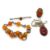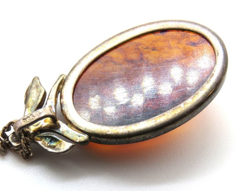 Four pieces of amber jewellery including silver ring and silver pendant on chain, brooch and bracelet.