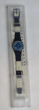 A Swatch watch in Forsail pattern, incorrect packaging, new battery within box. Disclaimer: Please note watches are sold as untested and without guarantee.