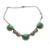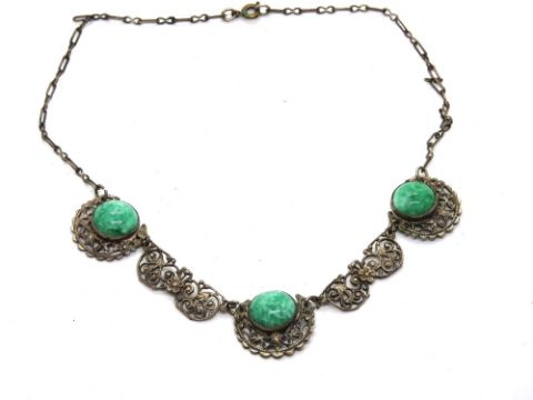 A mid century Bohemian necklace having pierced panels and green cabachons upon.
