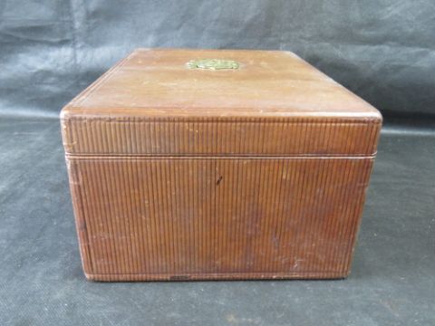 A leather covered jewellery case opening to reveal velvet lined slides within, 33 x 24 x 16cm.