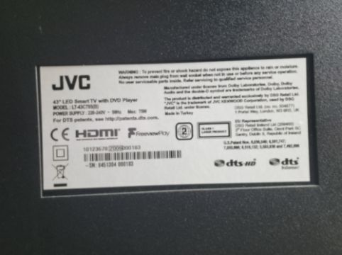 A JVC 43" LED Smart TV, with Amazon Fire stick and remotes. Sold in absentia - collection is from Upper Boddington, Northamptonshire.