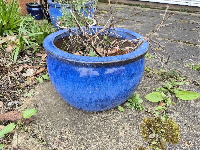 Three large blue glazed garden pots. Sold in absentia - collection is from Upper Boddington, Northamptonshire.