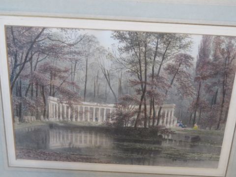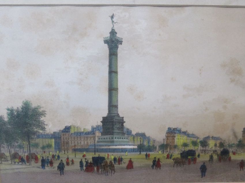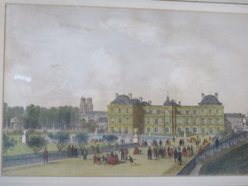 A set of five lithographic prints after Philippe Benoist. Parisian scenes including Luxembourg Palace, Louvre Colonnade, Place Royale, the Naumachia in the Parc Monceau and the Naumachia in the Parc Monceau. Sight size 35.5 x 23.5cm, matching whitewashed gilt frames 56 x 45cm.