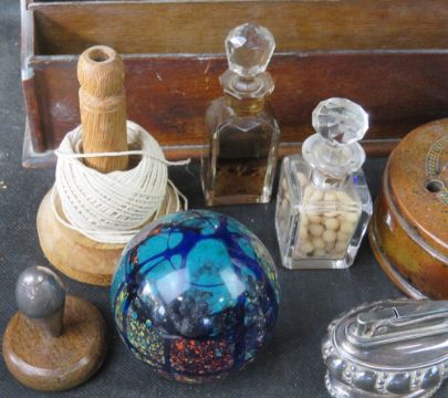 A quantity of desk ephemera including letter rack, paperweights, photo frame, inkwell, glass bottles, bin, etc.