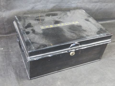 A large metal cash box.