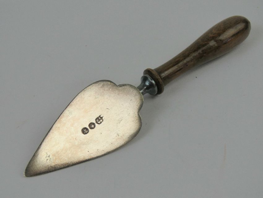 A silver plated masonic trowel having turned wooden handle, 14cm in length.