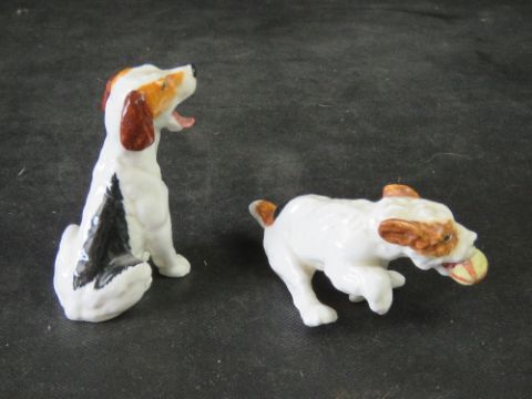 Two Royal Doulton character dog figurines from the "Dogs of Character" series inspired by Cecil Aldin, a seated Beagle or terrier-type and a Jack Russell with ball.
