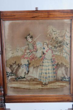 A good rosewood 19th century rise and fall fire screen, spindle turned throughout and having Scottish themed needlepoint panel to screen, 117cm high, 48cm wide.