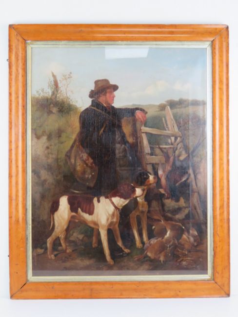 Follower of Richard Ansell (1815-1885), 19th century oil on canvas, The English Gamekeeper, a gamekeeper leans on fence with game and holding a pair of Pointer gun dogs, 26 x 20" (66 x 50.7cm). In a moulded Birds-eye Maple frame, glazed.