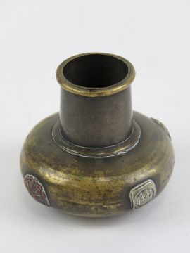 A c1900 Japanese Shakudo stick top / walking cane knop in brass having various applied symbols and leaves in the Shakudo manner, 1 5/8" (3.75 cm) diameter.
