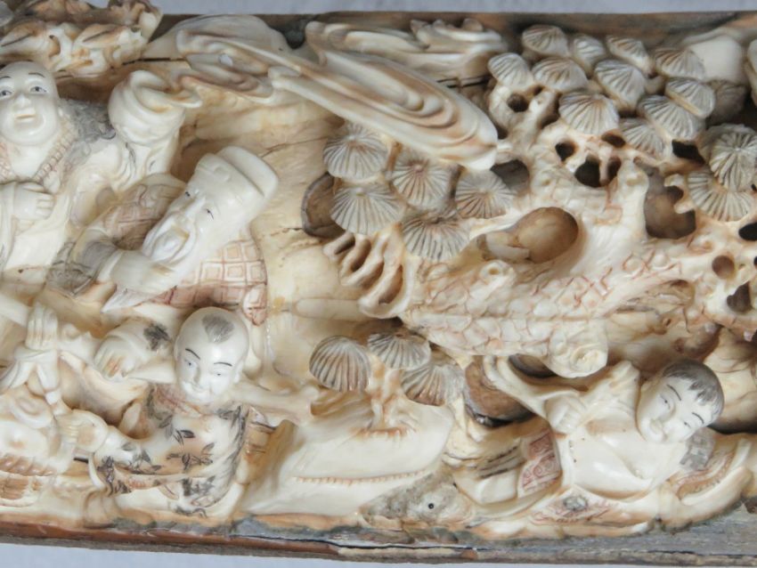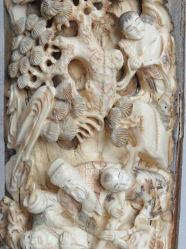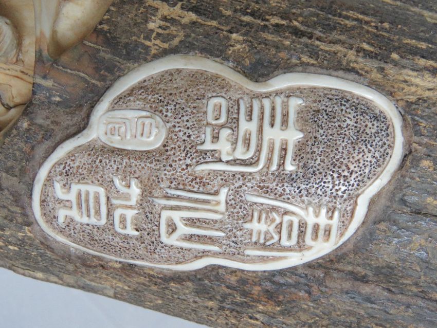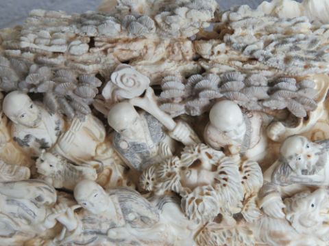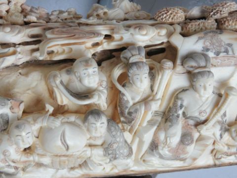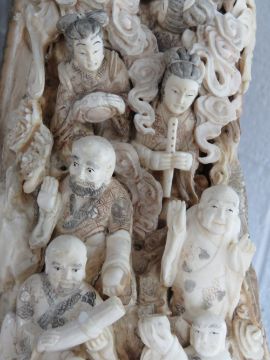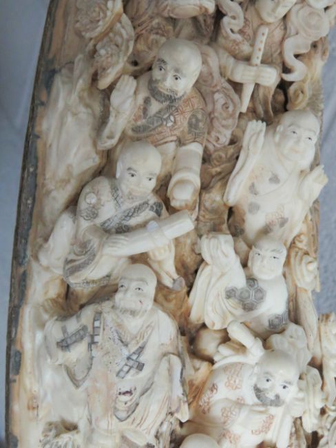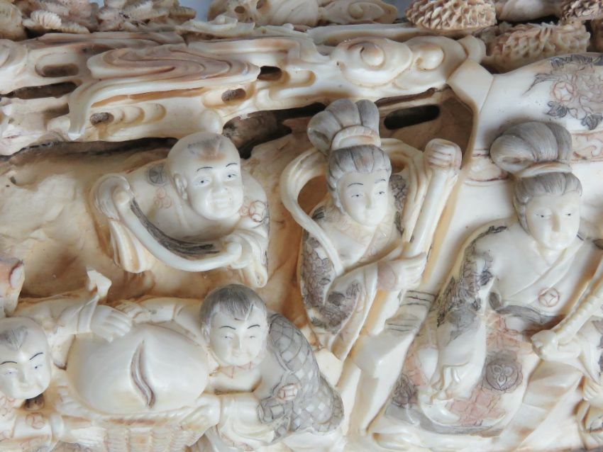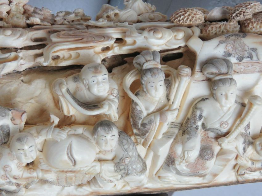 A full length male Woolly Mammoth incisor (Extinct Genus Mammuthus Primigenius 10,000 - 20,000 years old) profusely carved and pierced to the inside curve with figures, birds, musicians and tradesmen upon, bearing signature to the right hand side, comprising approx fifty-three carved figures, one monkey, one lion, and mythological bird, together with flora and fauna throughout, approx 200cm in curved length and presented upon a fine quality carved and pierced tree like stand approx 78cm high.