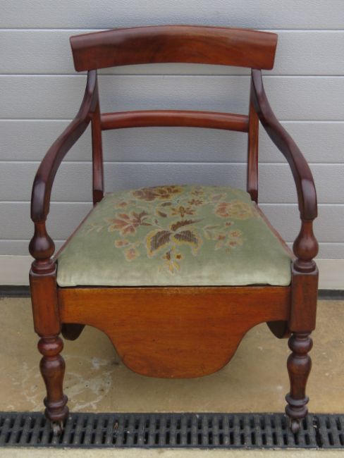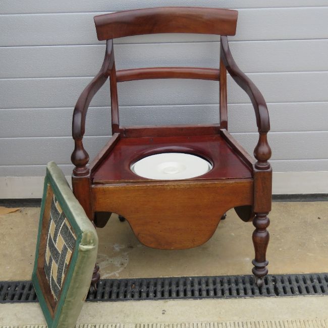A late Victorian mahogany bar back commode chair with ceramic insert (freshly emptied).