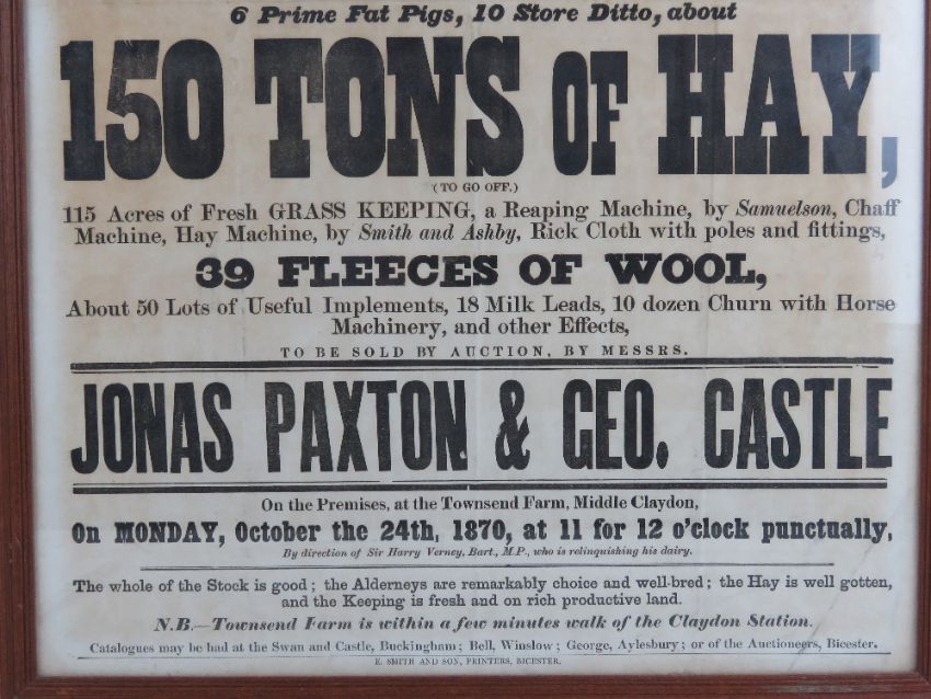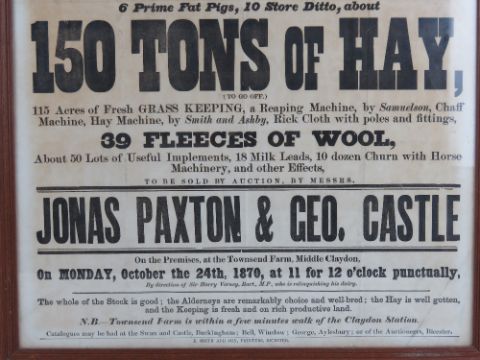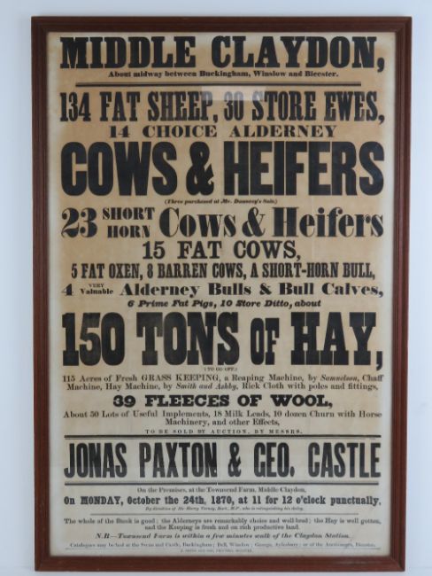 Rare Auction poster: 'Jonas Paxton & Geo. Castle 24th October 1870, Townsend Farm Middle Claydon' to include '134 Fat Sheep, 30 store Ewes, 14 choice Alderney Cows & Heifers ...23 Short Horn Cows and Heifers...150 Tons of Hay ....39 fleeces of wool etc.'. Framed and glazed, 31 x 21" (78.7 x 53.3cm). This is especially rare as there has only ever been one auction ever held at Townsend Farm, Middle Claydon.