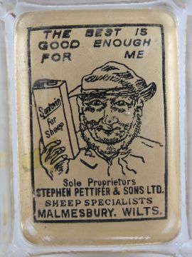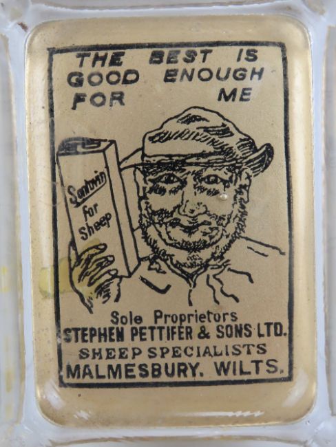 Agricultural Bygone: an unusual early 20th century farming advertising ashtray, glass and gilt with black writing, marked ' Santovin, Sole Proprietors Stephen Pettifer & Sons Ltd, Sheep Specialists, Malmesbury, Wilts'. Measuring 4 3/4 x 3 1/2" (12 x 9cm).Footnote: Santovin was a tincture for the good health of sheep.
