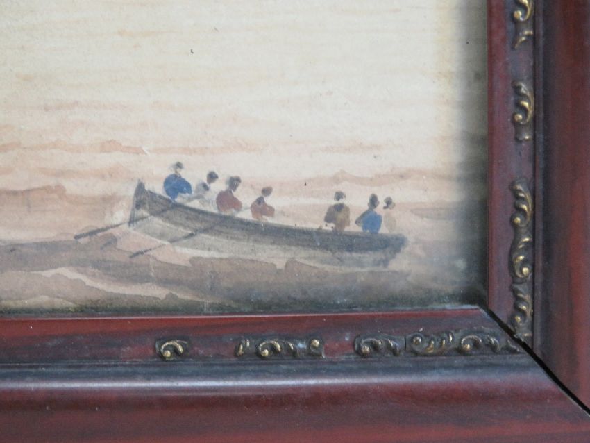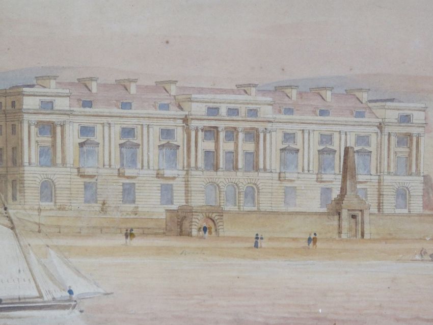 Georgian Palladian Architectual School, watercolour on paper laid on canvas. An English Georgian design for a sea front depicting Palladian buildings with people in boats etc. Not signed but intricately drawn and then watercoloured, 44 1/2 x 13" (113 x 33cm). Framed.