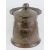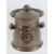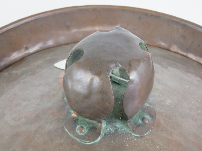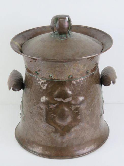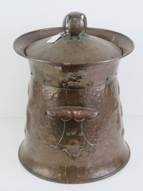 Arts and Crafts: a beaten (planished) copper cylindrical coal / log bin with lid, having riveted shaped handles to side with embossed shield like decoration upon, standing 17” (43.2 cm) high.
