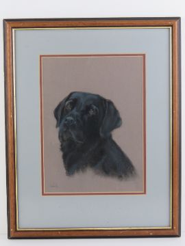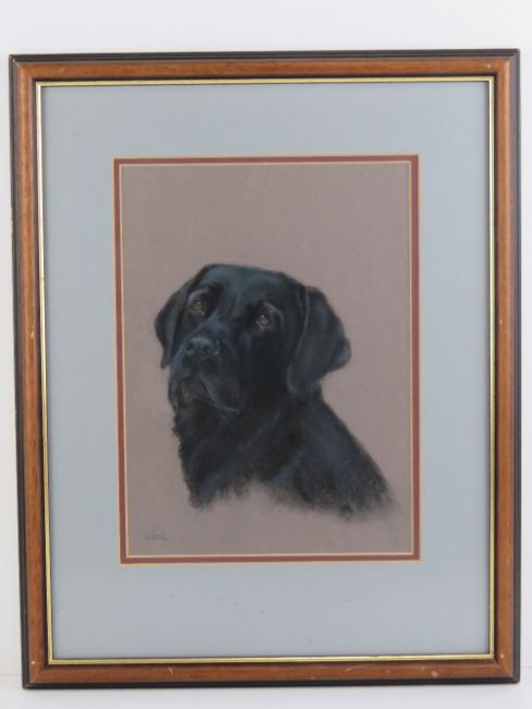 Paul West, 20th century pastel, a black Labrador gun dog, signed lower left and labelled verso, aperture 12 x 8 3/4" (30.5 x 22.2cm). Behind non-reflective glass.