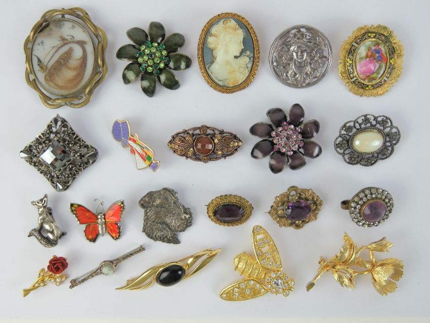 A quantity of vintage brooches including a Victorian spinning fob mourning brooch a/f having hairwork and portrait within, etc.