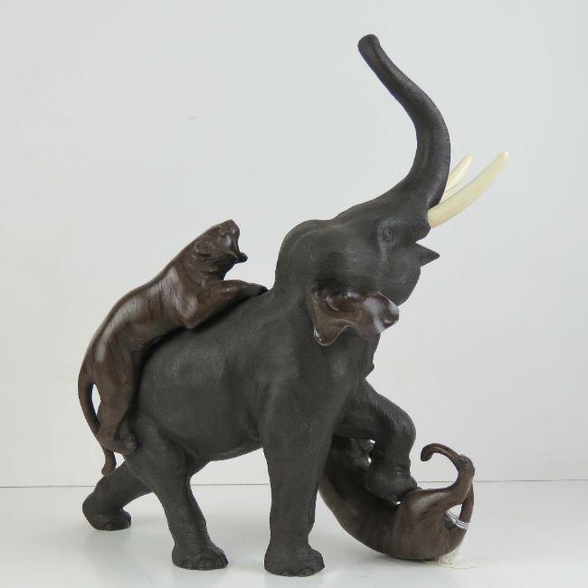 A fine quality late 19th century Meiji era (1868-1912) Japanese bronze elephant and tiger group by the Japanese animalier sculptor Genryusai Seiya (active c 1900) signed in seal form on the underside, 38cm wide, 44cm high.