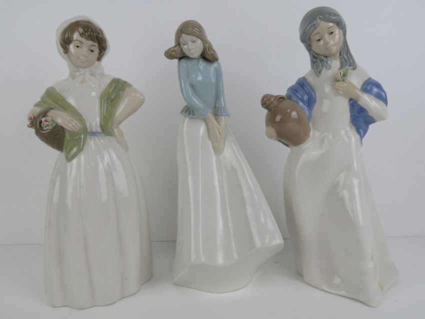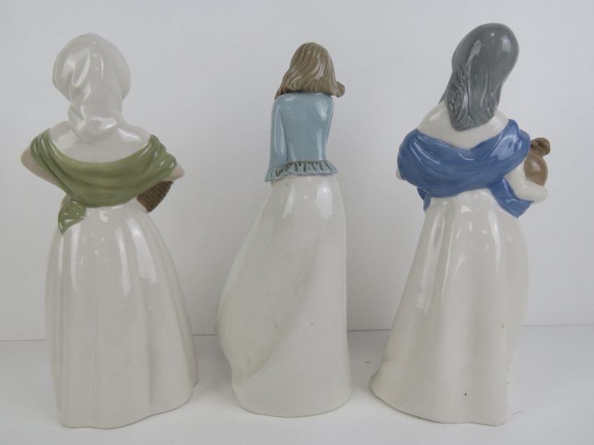 Three large Lladro type standing lady figurines, various makers, one having rose deficient.