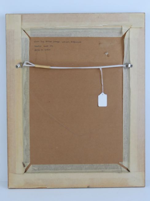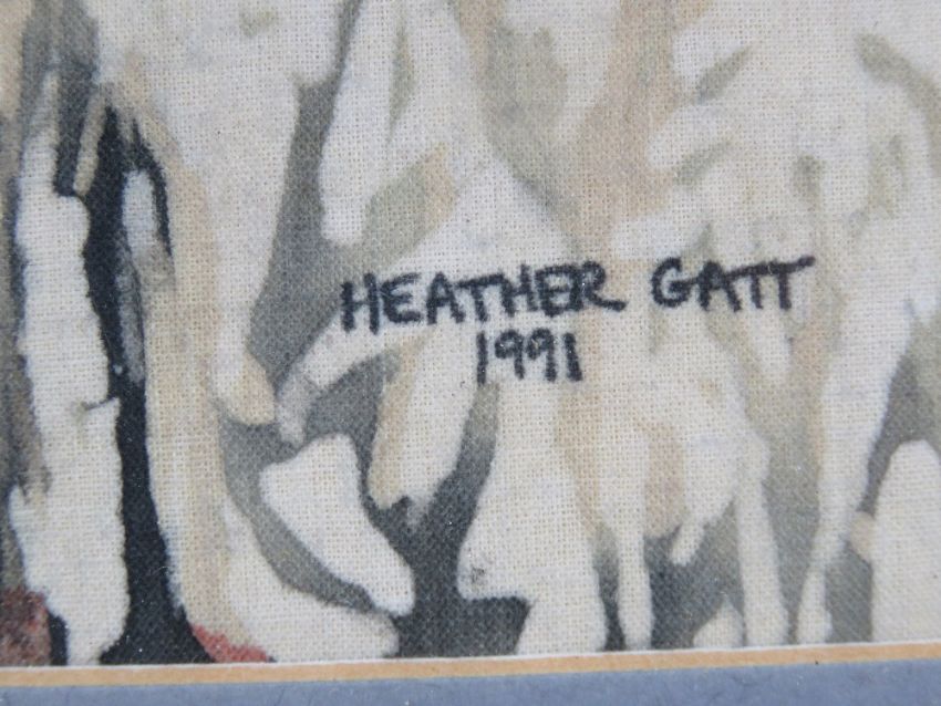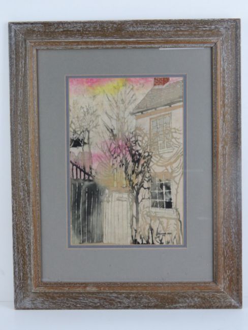 Heather Gatt 1991, batik on cotton, 'Winter Sky behind cottage, Woburn, Bedfordshire'. Signed and dated lower right and details verso. 12 1/3 x 8 1/2"(32 x 21.5cm).