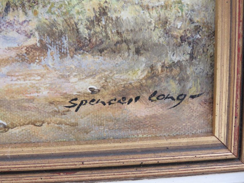 Oil on canvas; village scene with church beyond, signed lower right Spencer Long, 25 x 29cm.