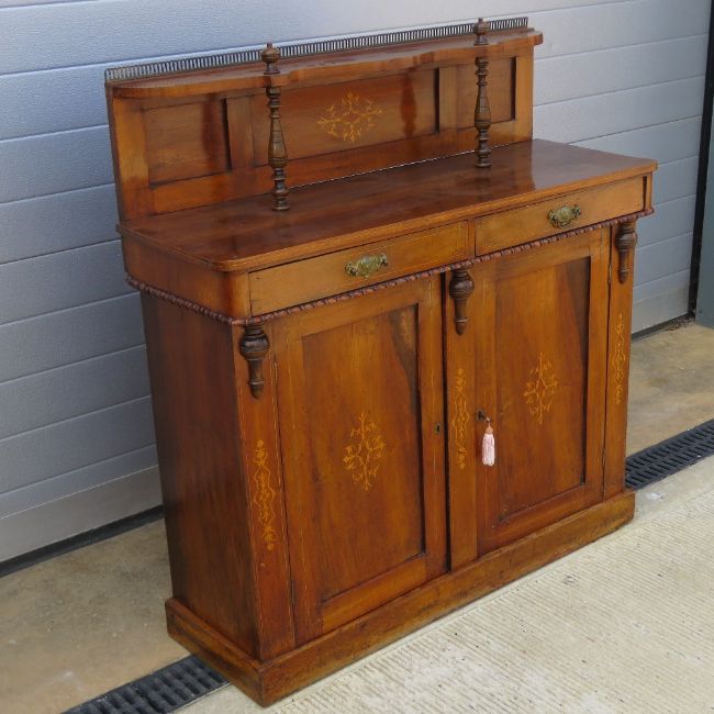 A short inlaid buffet sideboard having shaped shelf with galleried rail, twin frieze drawers with doors under, 104cm wide.