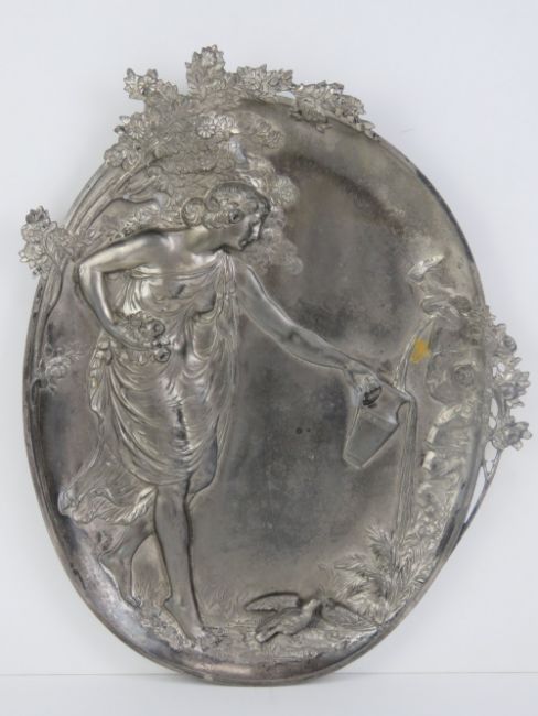 An Art Nouveau large oval WMF embossed tray, old silver finish, decorated with an embossed image of a classical maiden filling a jug from a water fall, signed reverse top, 15 x 11".