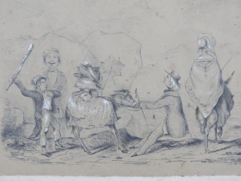 Georgian Cartoon; highlighted pencil image, numbered lower left, stubborn donkey, a man, with walking cane, pulls at the head and a boy threatens to strike a donkey which has a woman with parasol upon whilst looked on by a figure and a further donkey, ridden by a bonneted lady, goes by down to the seaside beach. Numbered for plate lower left or signed with a 'B'. 5 1/4 x 8 1/8 (13 x 20.5cm).