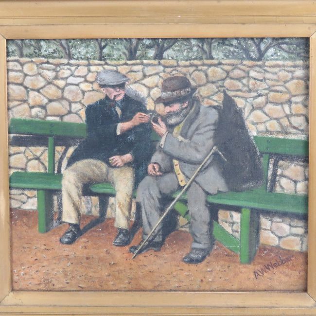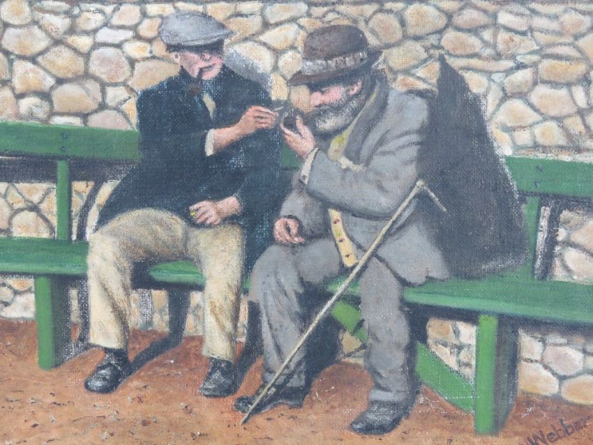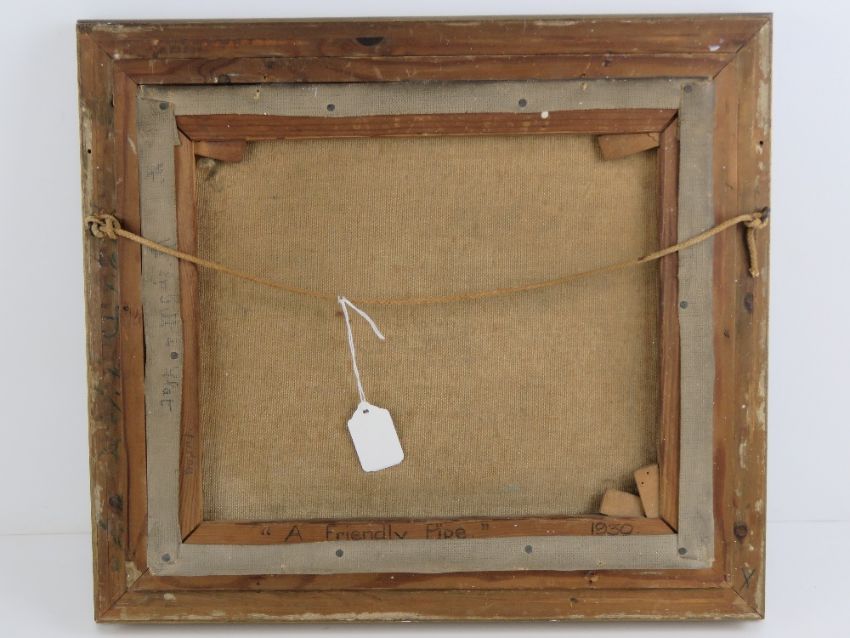 A.W. Webber 1930, oil on canvas, 'A Friendly Pipe', two gentlemen sat on a bench share tobacco and a light for their pipes. Signed lower right and titled with date verso. 12 x 14" (30.5 x 35.6cm).