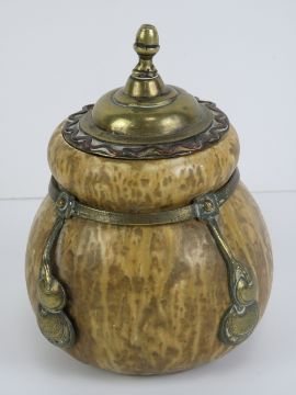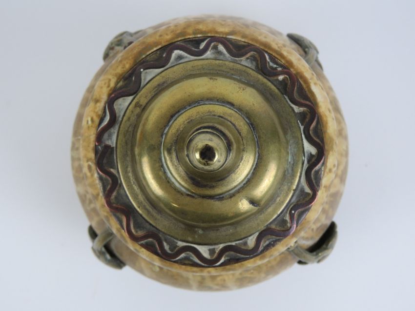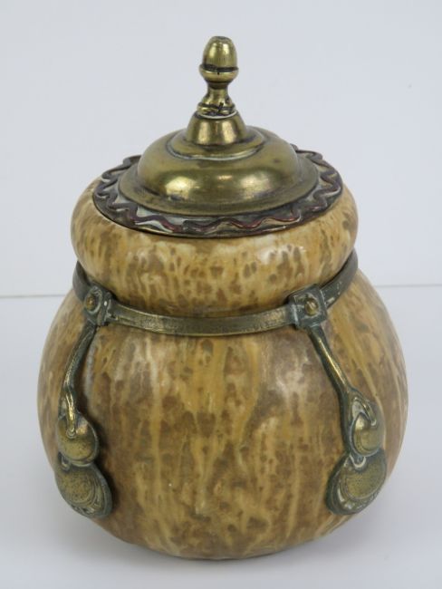 A c1900 Austrian Art Nouveau buff drip finish gourd shaped lidded pot, standing 6" (15cm) high, 4 1/2" (10.15cm) wide with applied brass furniture and removable lid. Marked under 'A' ( Amphora ?), stylised A, small 'a' and the number '0210'.