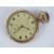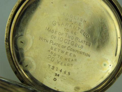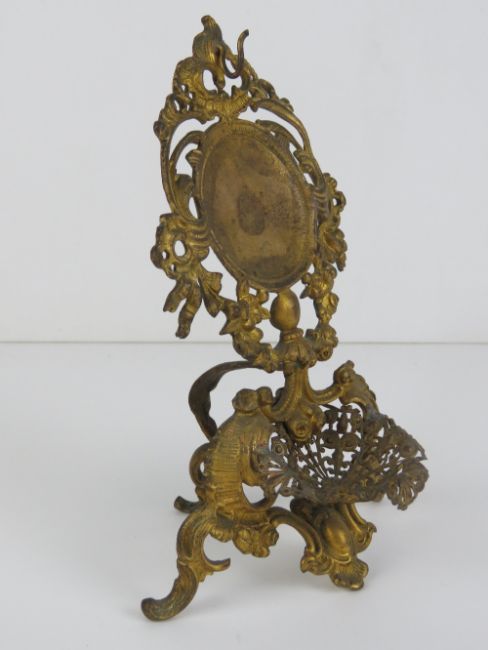 Pocket watch and stand: a Dennison gold plated top wind pocket watch, with seconds dial at 6. Together with a gilt metal circa 1900 Rococo Revival pocket watch stand (for bedside use etc.). The stand 6 1/2” ( 16.5 cm) high.