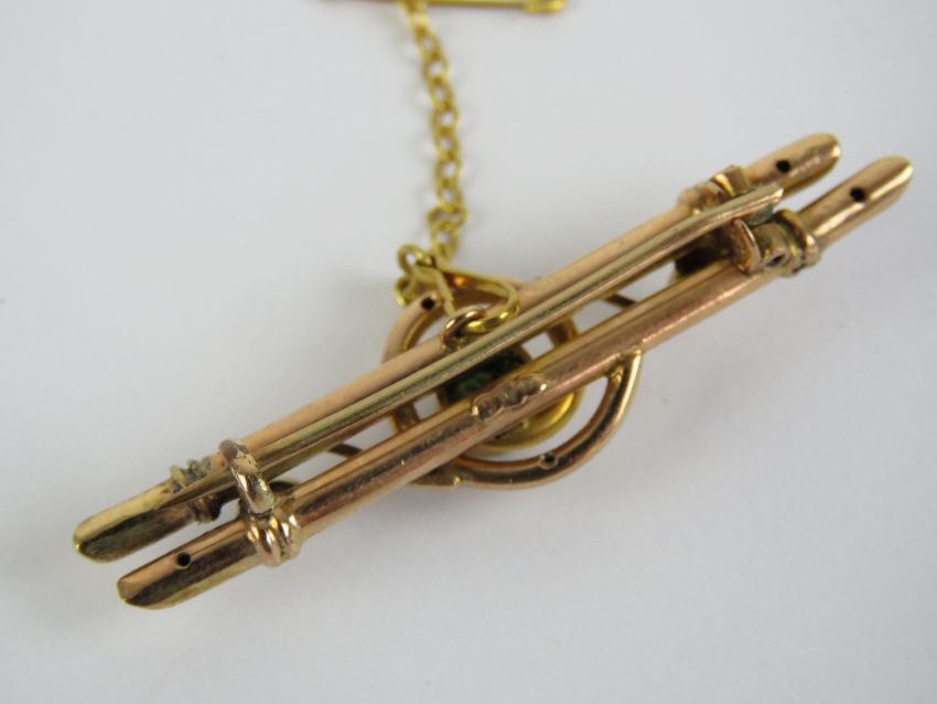 A rose metal double bar brooch having scrollwork upon and central round cut peridot approx 0.3ct, having yellow metal guard chain, 3.2g.