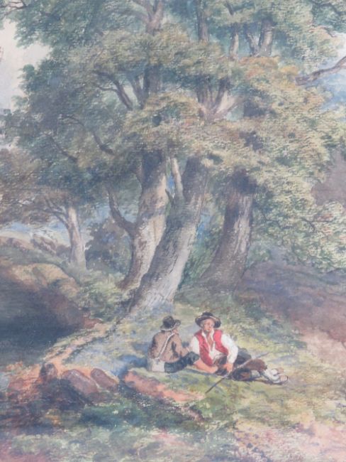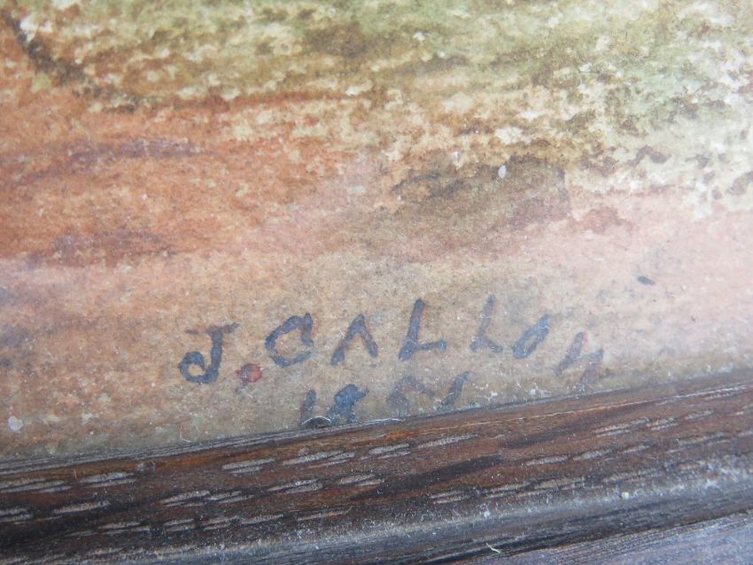 Watercolour; study of a ruined moated castle, figures and trees to the right, sky beyond etc, signed lower right J Callow 1857, 42 x 63cm.