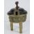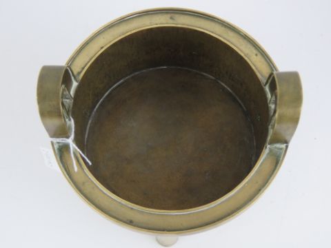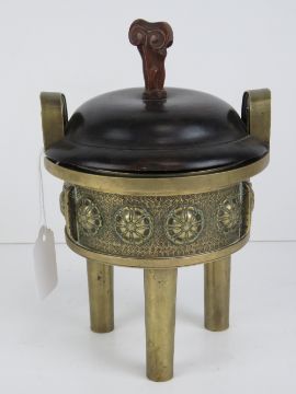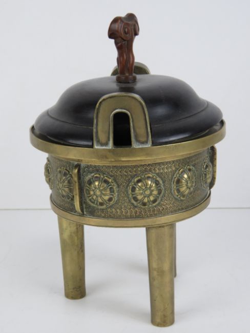 An Oriental late 19th / early 20th century brass censor raised over three tapering legs, having floral decoration and twin handles, with wooden lid, all standing 22cm high.