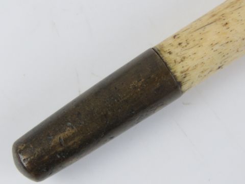 A carved whalebone cane having ladies leg top, 79cm in length.
