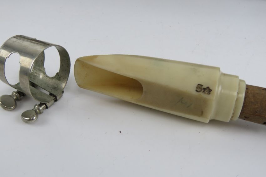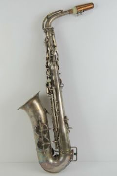 Saxaphone; an old silver plated ALTO saxaphone musical instrument with Mother of Pearl inlaid buttons, made by Universal Savanna, Paris, approx 26" (66 cm) in length. Cased.