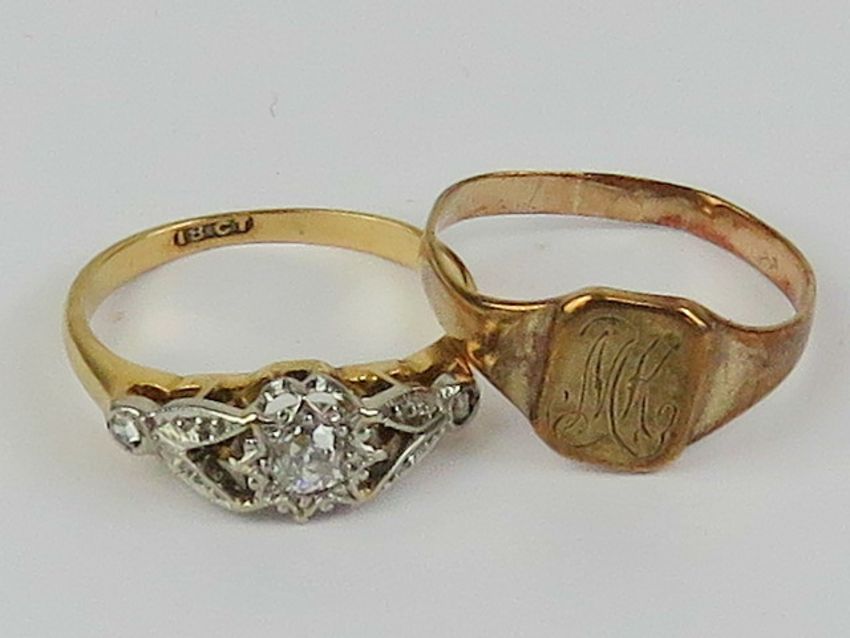 An 18ct gold solitaire diamond ring, approx 0.1ct diamond set in white metal on a yellow metal ring stamped 18ct, size J, 2.3g. Together with a 9ct gold signet ring, size J, 1.3g.