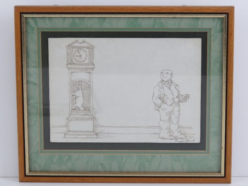 Simon Bond (1947-2011), pen ink illustration, long case clock from the '101 Uses for a Dead Cat'. Signed lower right and bears Il Libro headed note paper where it states ' ..this is the original from ' 101 Uses of a Dead Cat '. Drawn in 1980 with my own fair hand ! Honest ! '5 3/4" x 8 1/4" ( 14.5 x 21 cm).