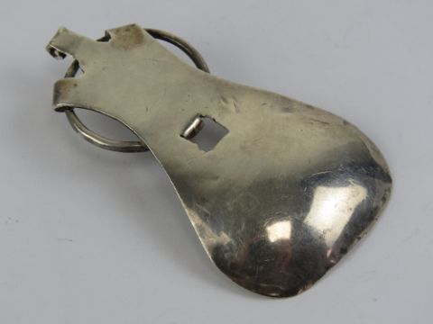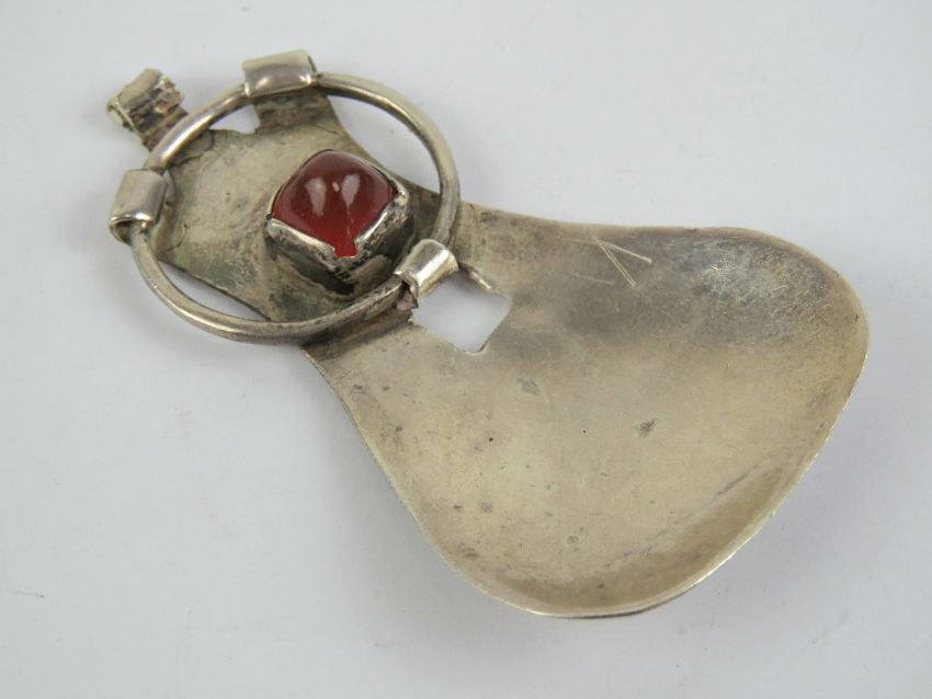 A handmade Arts and Crafts tea caddy spoon, white metal (tests as silver) having inset carnelian cabachon, 2 3/4" (7 cm) in length, total weight 18.8 g.