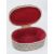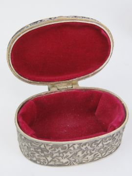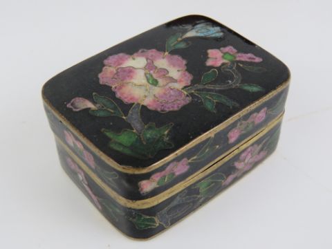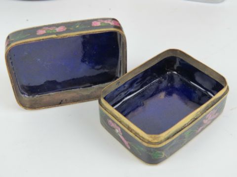 A vintage turned mahogany pin cushion, together with a plated leather covered miniature hip flask, plated cigarette case, plated oval lidded jewellery casket, and a small lidded cloisonné pill box. Five items.