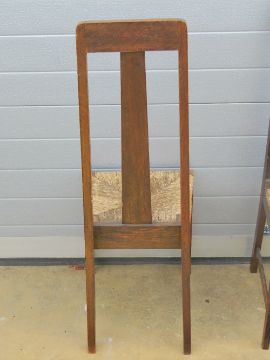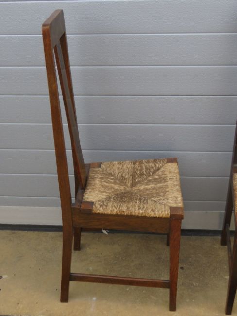Art Nouveau: Mackay Hugh Baille Scott (1865-1945) for Gillows of Lancashire, a pair of rush envelope seated oak high back chairs, square tapering front legs, with inlay to the angled central splat and stamped under 'L39495 '& 'L4094', 41" (104.1cm) high.Footnote: Baille-Scott is known to have designed for Gillows c.1901.