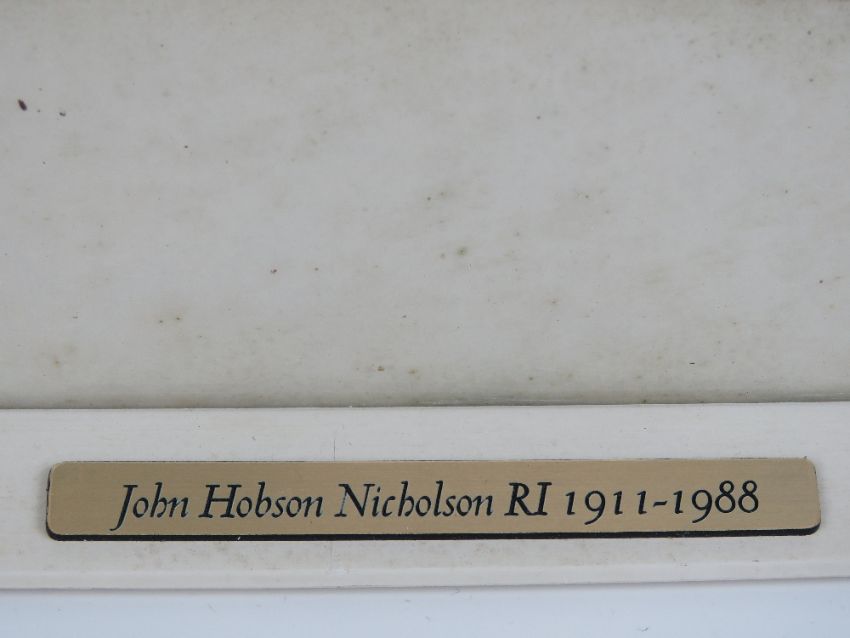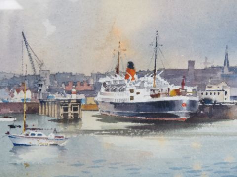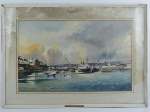 John Hobson Nicholson (1911-1988) RI, watercolour with gouache highlights, 'Douglas' Isle of Man showing harbour and mariner. Signed lower left and labelled to frame, titled verso, 13 3/4 x 21 3/4" (35 x 55.3cm).