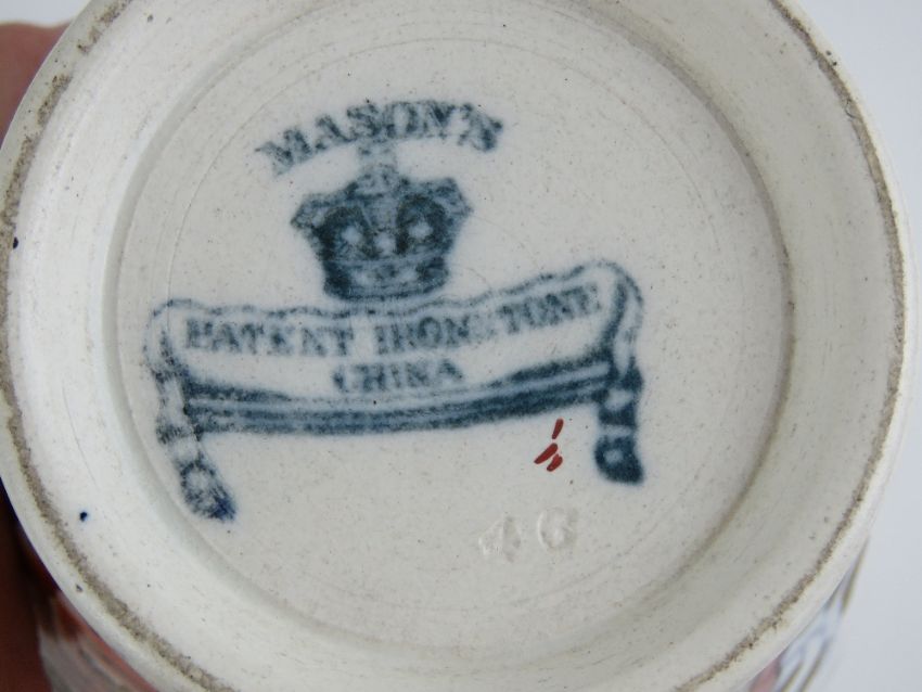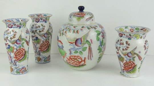 A Masons Ironstone open necked short vase, together with matching pair of tall vases and ginger jar en-suite. Four items.