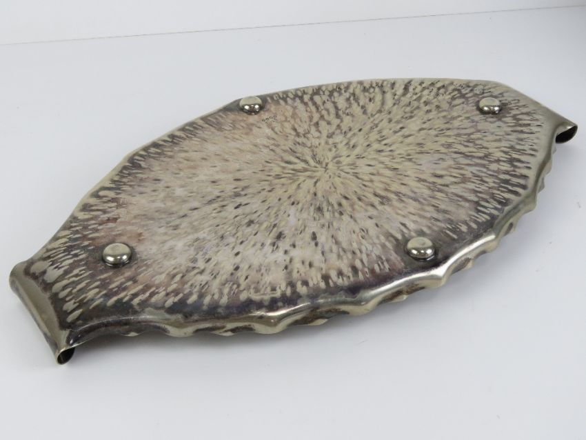 An Arts and Crafts Hukin and Heath oval twin handled silver plated tray, designed by Dr. Christopher Dresser, no.'7018', hammered bark effect decoration, measuring 9" (22.8cm) wide x 15 3/4”(40 cm) in length.