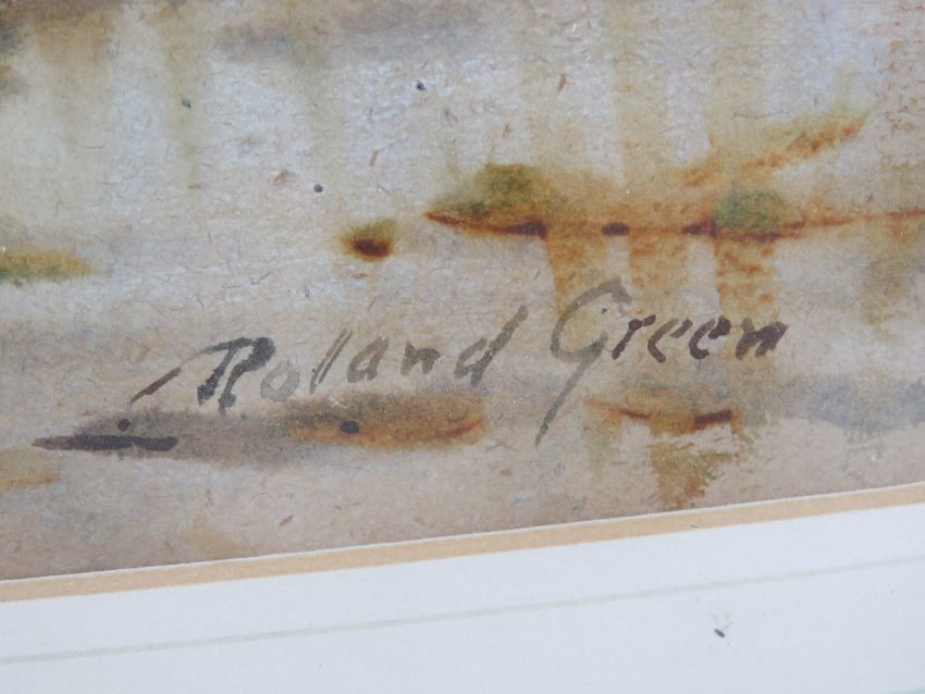 AR Roland Green (1896-1972) watercolour; Ducks in flight over an estuary, signed lower right, 26 x 36cm, framed and glazed.